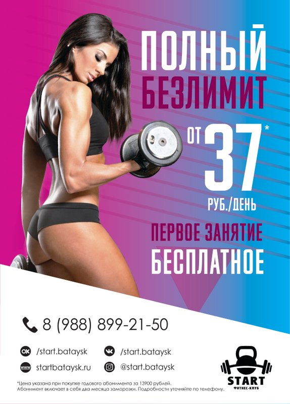 По поводу дней и времени вы можете получить подробную информацию у сотрудников фитнес-клуба Старт в Батайске. И не забудьте обсудить с ними или вашим тренером важные вопросы допустимых и нежелательных нагрузок. Мы постараемся сделать всё для вашего здоровья и хорошего самочувствия!